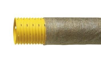 Eurodrain 50/42 mm PVC-drænrør med 1,2 x 5 mm slidser og geotekstilfilter. Leveres i 50 m rulle.