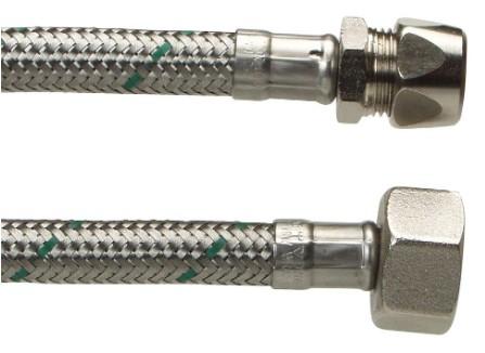 Fleksibel tilslutningsslange af høj kvalitet til både koldt- og varmt brugsvands. Kompressionskoblingen kan f.eks. tilsluttes direkte til det halvbløde kobberrør der sidder på nogle vandhaner, eller til en PEX slange med støttebøsning.