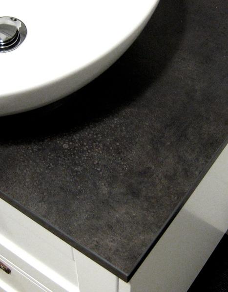 Bordplade i mørkegråt, stenmønstret laminat. Boring af huller til håndvask og blandingsbatteri udføres af installatøren alt efter håndvaskmodel og valg af placering.