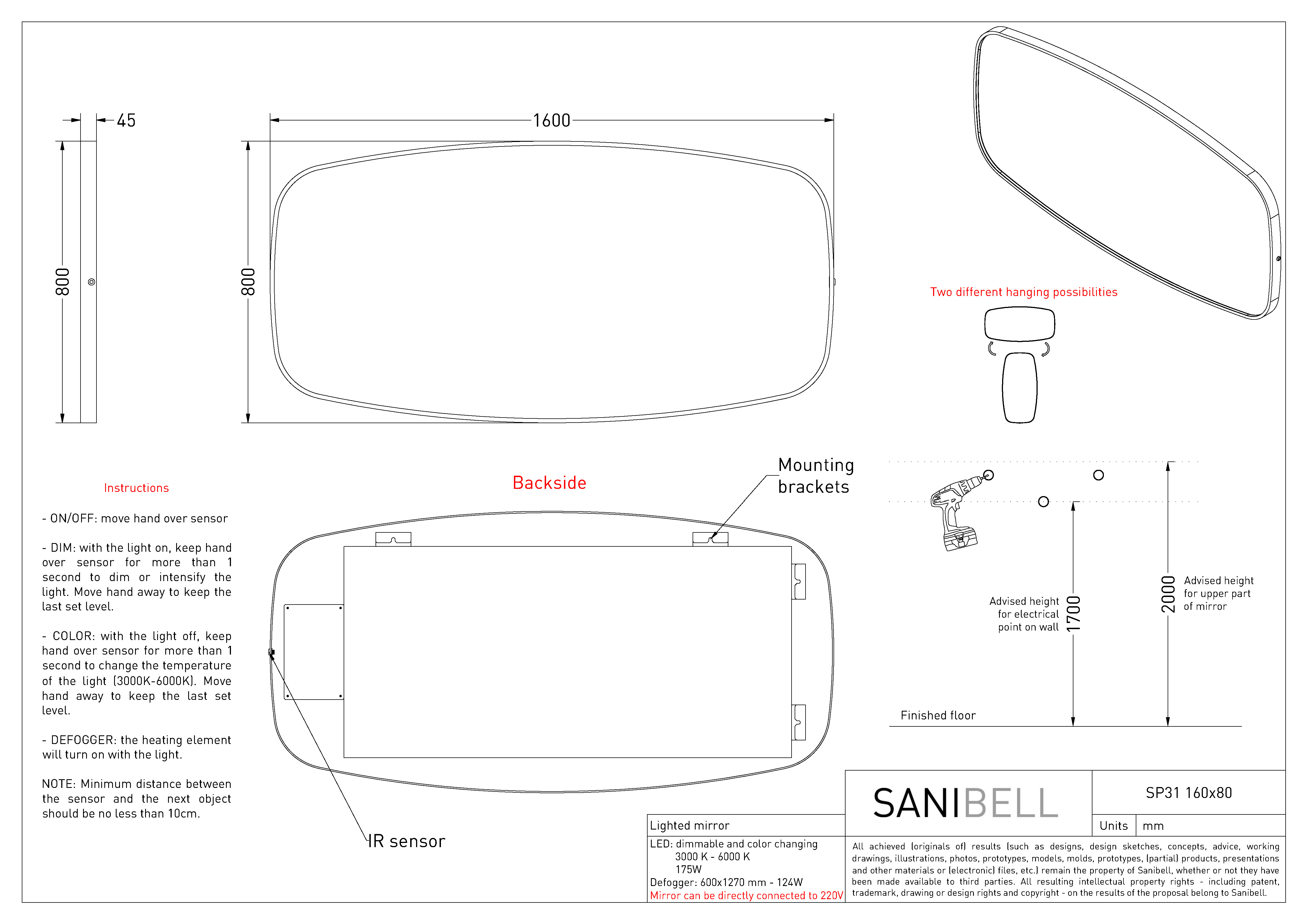 Sanibell Ink SP31 spejl m/lys, varme og sensor 160 x 80 cm - Mat hvid