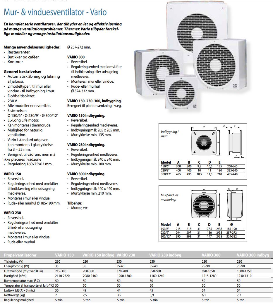 Thermex Vario 150/6 mur & vindue ventilator En ventilator som kan løse mange forskellige ventilationsproblemer. Vario Serien kan anvendes mange steder som f.eks restauranter, butikker, caféer og kontorer. En kraftig ventilator som bruges hvor der virkelig skal flyttes noget luft. Thermex Vario er en komplet serie ventilatorer, der tilbyder en let og effektiv løsning på mange ventilationsproblemer. Ventilatoren monteres i mur eller vindue. Alle modeller er reversible