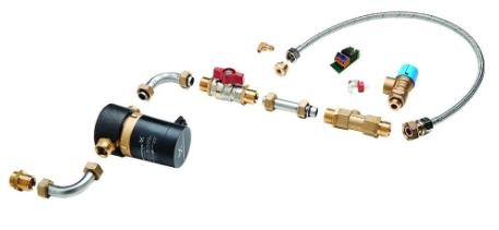 Cirkulationssættet kan eftermonteres, hvis ventetiden på varmt vand ved tapstedet medfører gener eller uønsket vandspild. Sættet leveres med pumpe. Når sættet er installeret, kan styringen indstilles således, at cirkulationspumpen kun er i drift, når brugeren normalt er hjemme. Derved reduceres udgifter til pumpens strømforbrug markant.